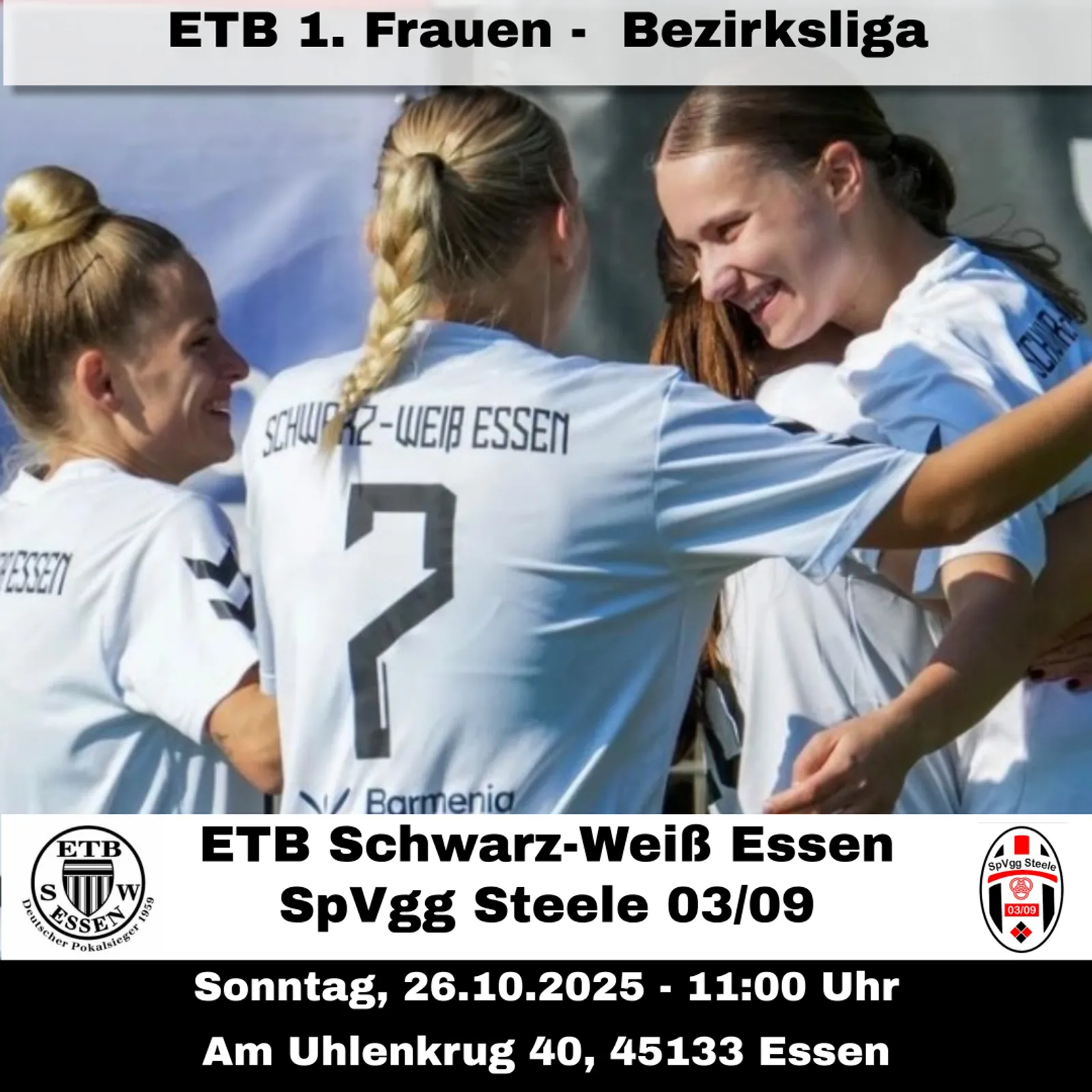 Am kommenden Sonntag um 11 Uhr empfangen die ETB Frauen die Landesligaabsteigerinnen Steele 03/09. Zunächst starteten zwei Mannschaften aus Steele in unterschiedlichen Bezirksligen, am Ende wurde die ehemals zweite Mannschaft zurückgezogen, so dass es nur noch eine Frauenmannschaft gibt, die zuletzt drei Jahre in der Landesliga und davor drei Jahre in der Niederrheinliga gespielt haben.