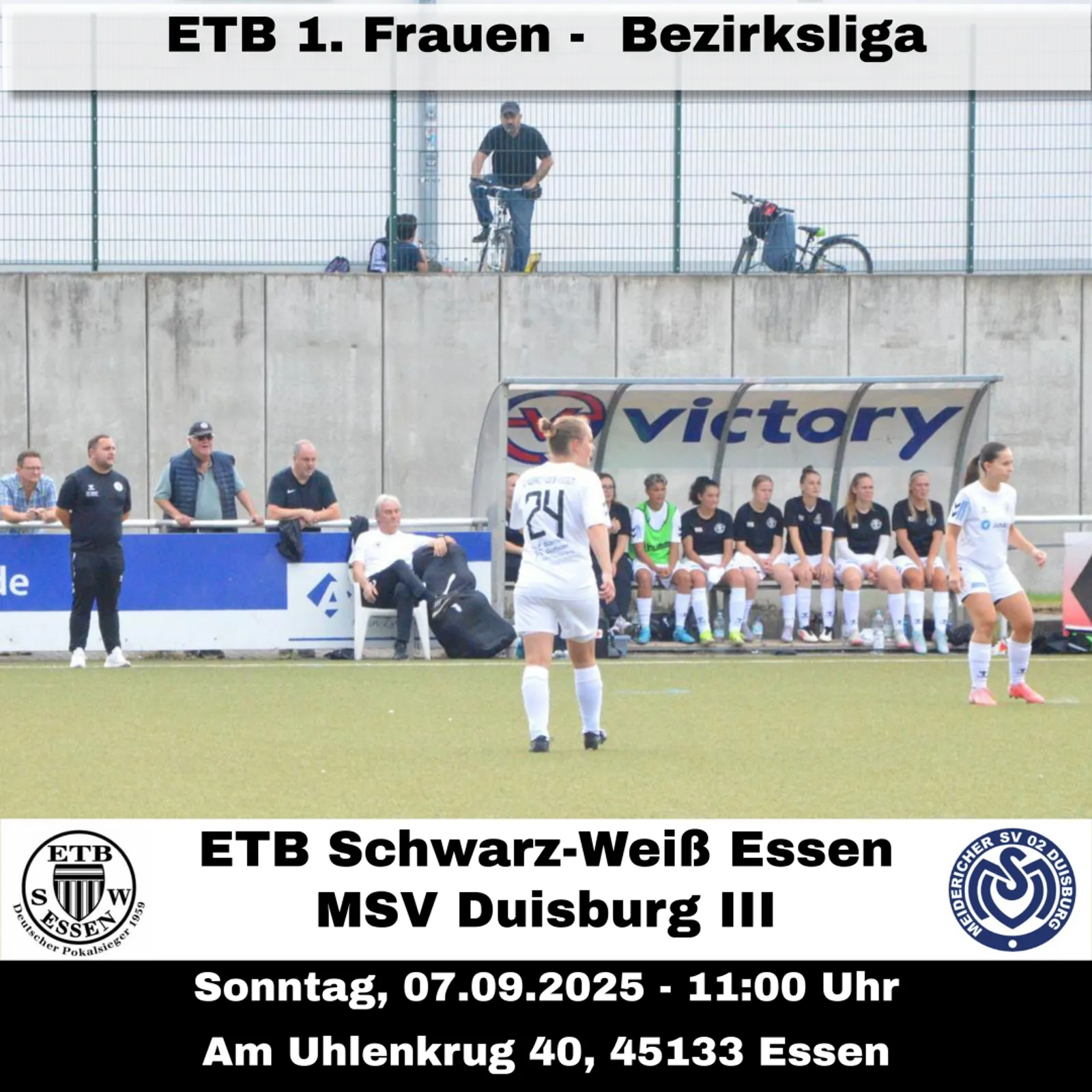 Am kommenden Sonntag um 11 Uhr empfangen die ETB Frauen den frisch aus der Kreisliga aufgestiegenen MSV Duisburg III. Die Duisburgerinnen haben ihr Auftaktspiel gegen den aus der Landesliga abgestiegenen SF Niederwenigern mit 0:1 verloren, die Frauen vom Uhlenkrug ihr erstes Spiel gegen TuS Essen West mit 7:0 gewonnen.