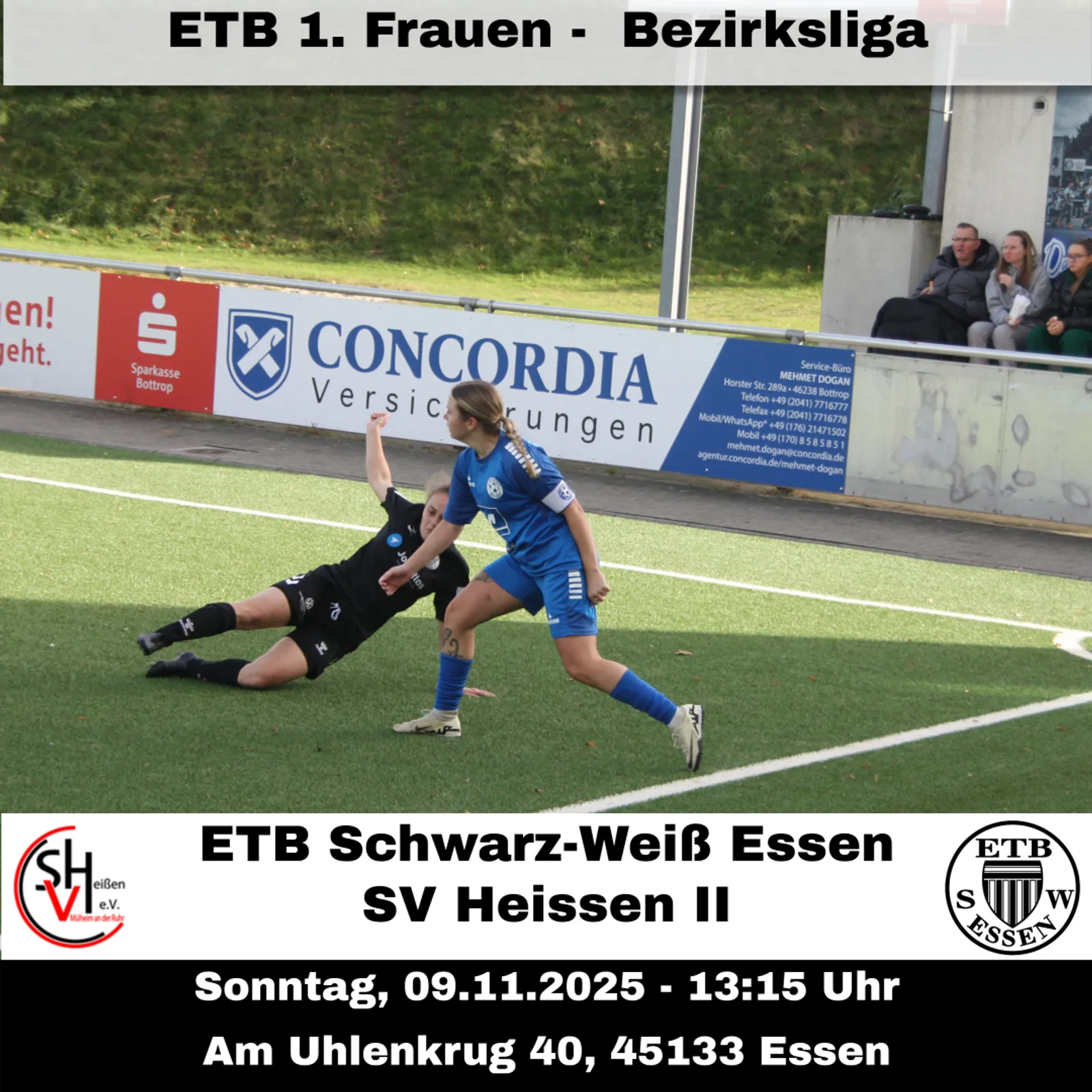 Am kommenden Sonntag empfangen die 1. ETB Frauen die zweite Mannschaft des SV Heissen. Heissen II belegt den 7. Tabellenplatz und hat aus 8 Spielen 11 Punkte geholt, während wir nach 7 Spielen 17 Punkte haben.