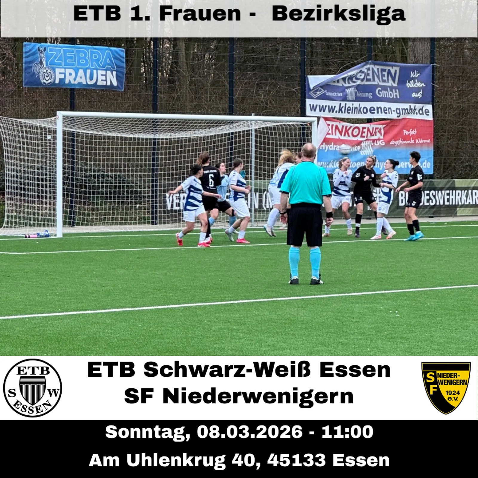 Am kommenden Sonntag um 11 Uhr spielen die 1. ETB Frauen gegen den Absteiger aus der Landesliga und direkten Tabellennachbarn SF Niederwenigern. 8 Punkte Vorsprung bei einem Spiel mehr, aber das Hinspiel haben wir nur knapp 1:0 gewonnen.