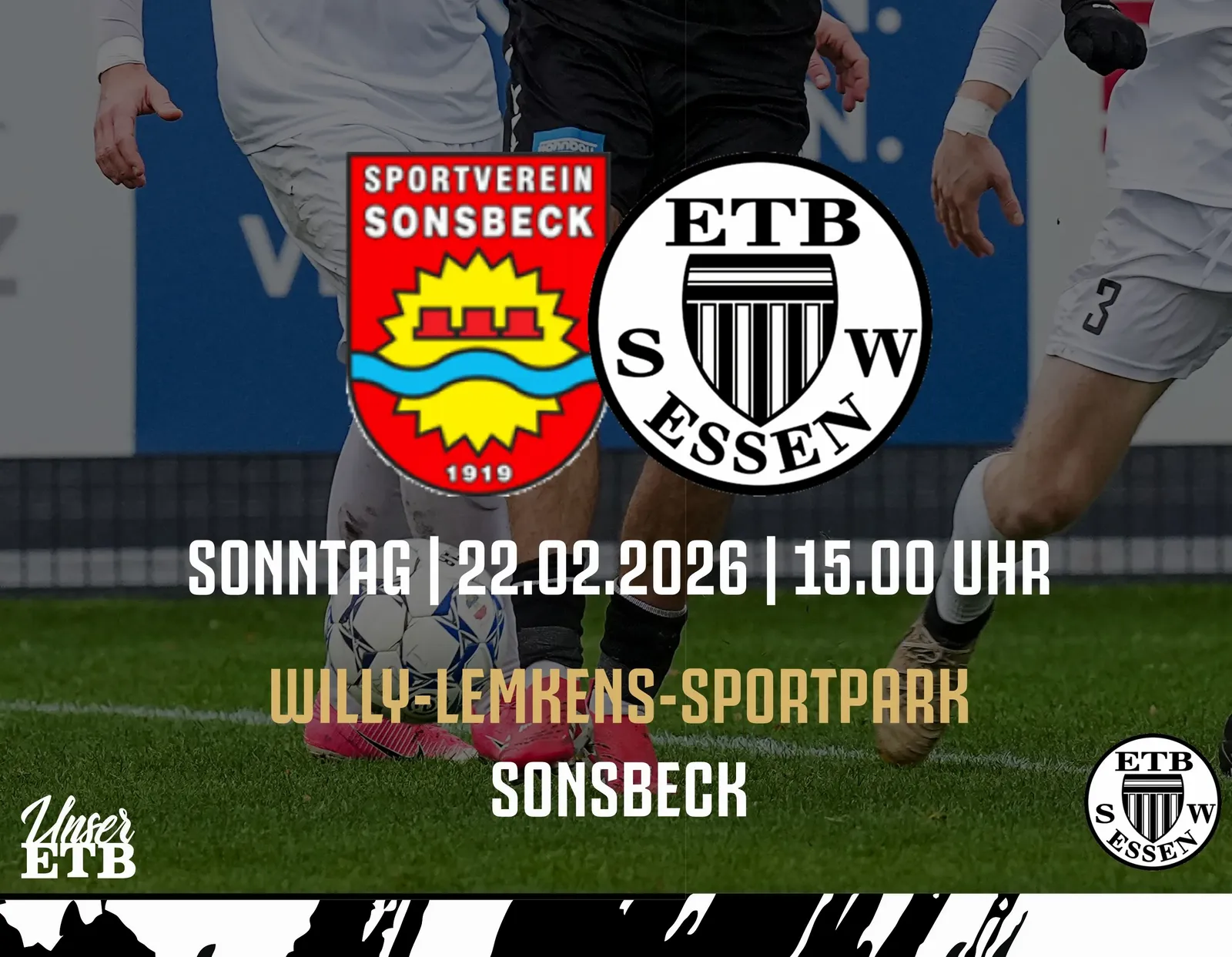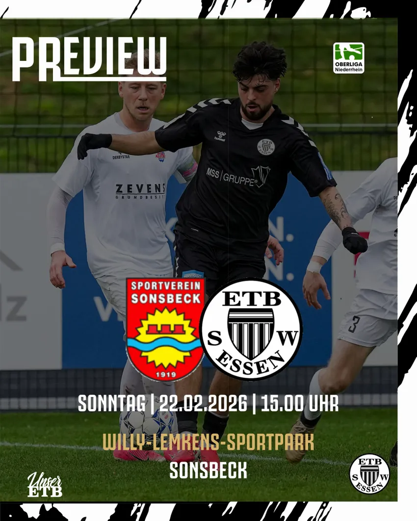 Das Jahr 2026 hat für den ETB Schwarz-Weiß Essen in der Oberliga Niederrhein nicht gut begonnen, denn das Team vom Uhlenkrug konnte in den bisher zwei absolvierten Meisterschaftsspielen nur einen Punkt ergattern. Das will die Mannschaft des ETB-Trainerduos Christian Dorda / Björn Matzel am kommenden Sonntag unbedingt ändern, wenn sie beim SV Sonsbeck antritt. Da die Schwarz-Weißen der Abstiegszone gefährlich nahe gerückt sind, müssen die Essener auf jeden Fall etwas Zählbares vom Niederrhein mitbringen. Die Partie wird um 15 Uhr im Willy-Lemkens-Sportpark (Parkstr. 8, 47665 Sonsbeck) angepfiffen.