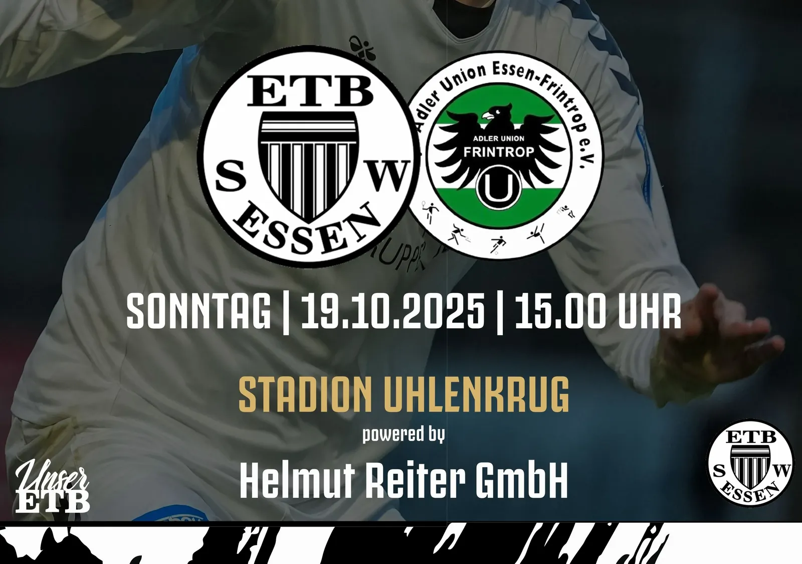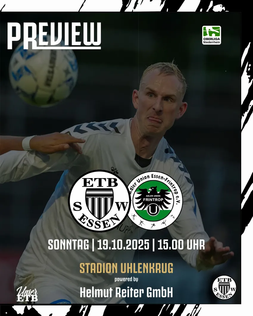 Am Sonntag trifft der ETB Schwarz-Weiß Essen in der Oberliga Niederrhein auf die DJK Adler Union Frintrop. Ein interessantes Stadtderby dürfte den Essener Fußballanhängern bevorstehen, denn beide Mannschaften sind mit elf Zählern punktgleich und direkte Nachbarn in der aktuellen Oberligatabelle. Mit besonderer Spannung wird der Auftritt der Schwarz-Weißen erwartet, die nun – nach der Trennung von Dennis Czayka unter der Woche – von Interimscoach Björn Matzel trainiert werden. Der Anpfiff im Stadion Uhlenkrug – powered by Helmut Reiter GmbH – erfolgt um 15 Uhr.