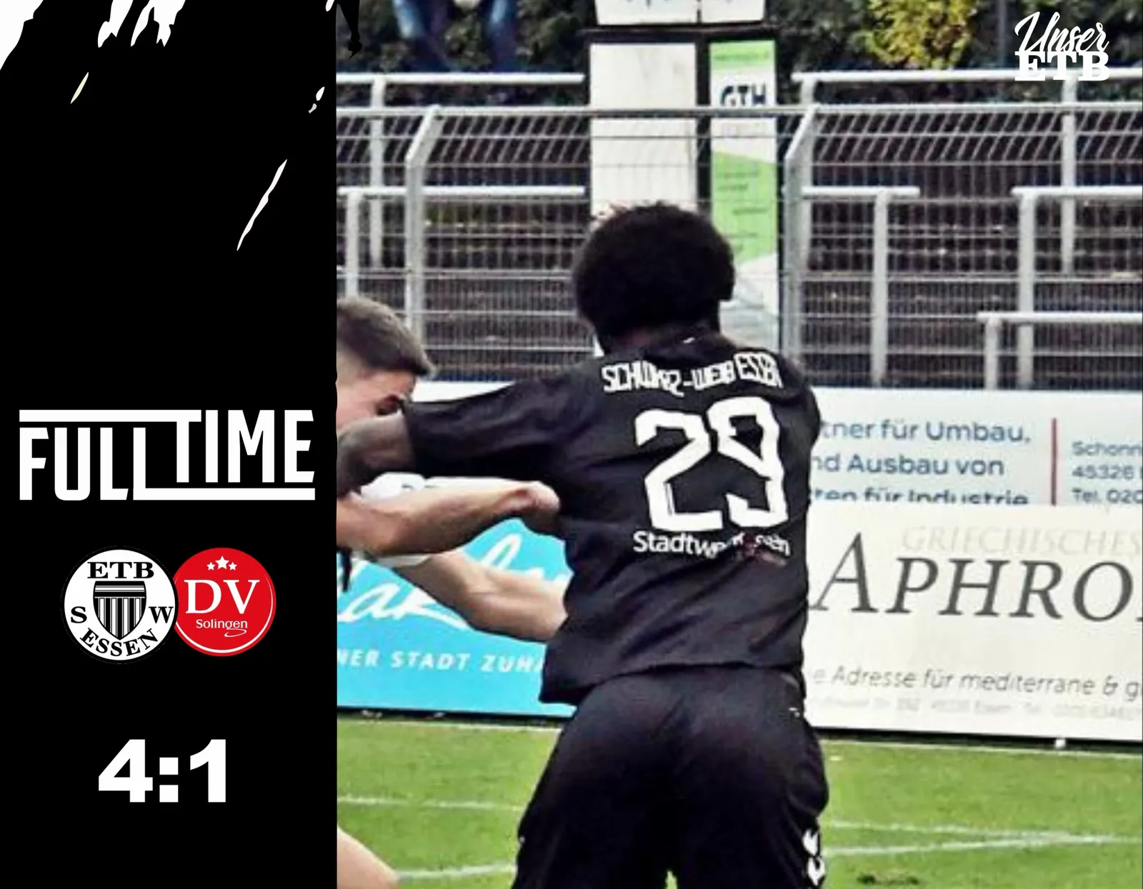 Drei Minuten nach dem Seitenwechsel konnten die Schwarz-Weißen auf 2:0 erhöhen: Nach einem Abwehrfehler der Solinger traf Marcello Romano aus elf Metern ins verwaiste Tor (48.). In der 82. Spielminute gab es dann das 3:0 für die Hausherren. Nach Vorlage von Luca Pinke drang ETB-Angreifer Rotosson Kanu in den gegnerischen Sechszehner ein und traf aus sieben Metern in die Maschen. Keine 60 Sekunden später rappelte es erneut im Kasten der Gäste: Nach Vorarbeit von Samir Bouzza konnte sich Youssef Kamboua die Ecke aussuchen und traf mit einem Flachschuss zur 4:0-Führung (83.). Den Schlusspunkt durften dann aber kurz vor Schluss die tapfer kämpfenden Solinger setzen. Nach einem Eckball von der linken Seite stocherte Eray Yigiter das runde Leder zum 4:1-Endstand über die Linie (89.).