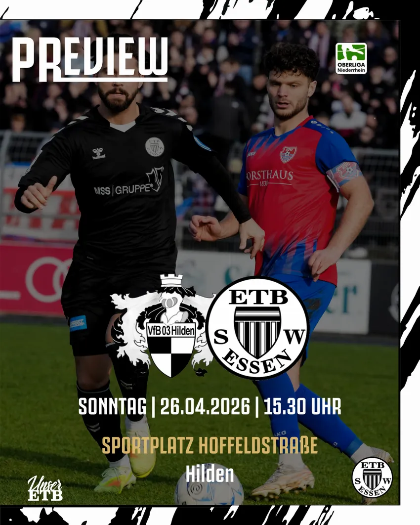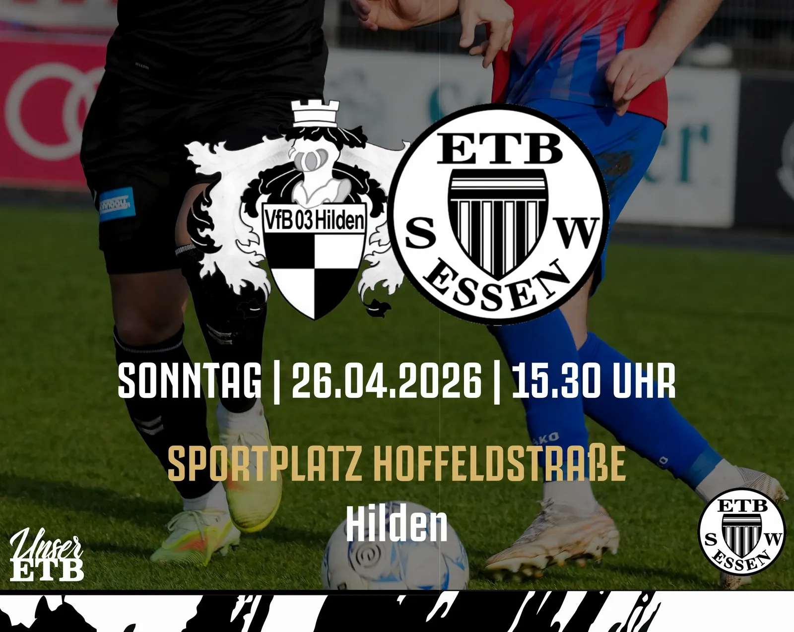 Da hat der ETB Schwarz-Weiß Essen in der Oberliga Niederrhein am Sonntag aber mal ein richtig dickes Brett vor der Brust, denn die Mannschaft des ETB-Trainerduos Christian Dorda und Björn Matzel muss beim Tabellenzweiten VfB 03 Hilden antreten. Die Hildener sind mit Abstand das beste Rückrundenteam und konnten zehn von elf Spielen gewinnen. Trotzdem wollen die Schwarz-Weißen natürlich auch vom VfB etwas Zählbares mit zurück nach Essen bringen, denn die letzten vier Auswärtsspiele konnte der ETB in der Meisterschaft alle siegreich bestreiten. Die Partie wird auf der Sportanlage Hoffeldstraße (Hoffeldstr. 106, 40721 Hilden) um 15.30 Uhr angepfiffen.