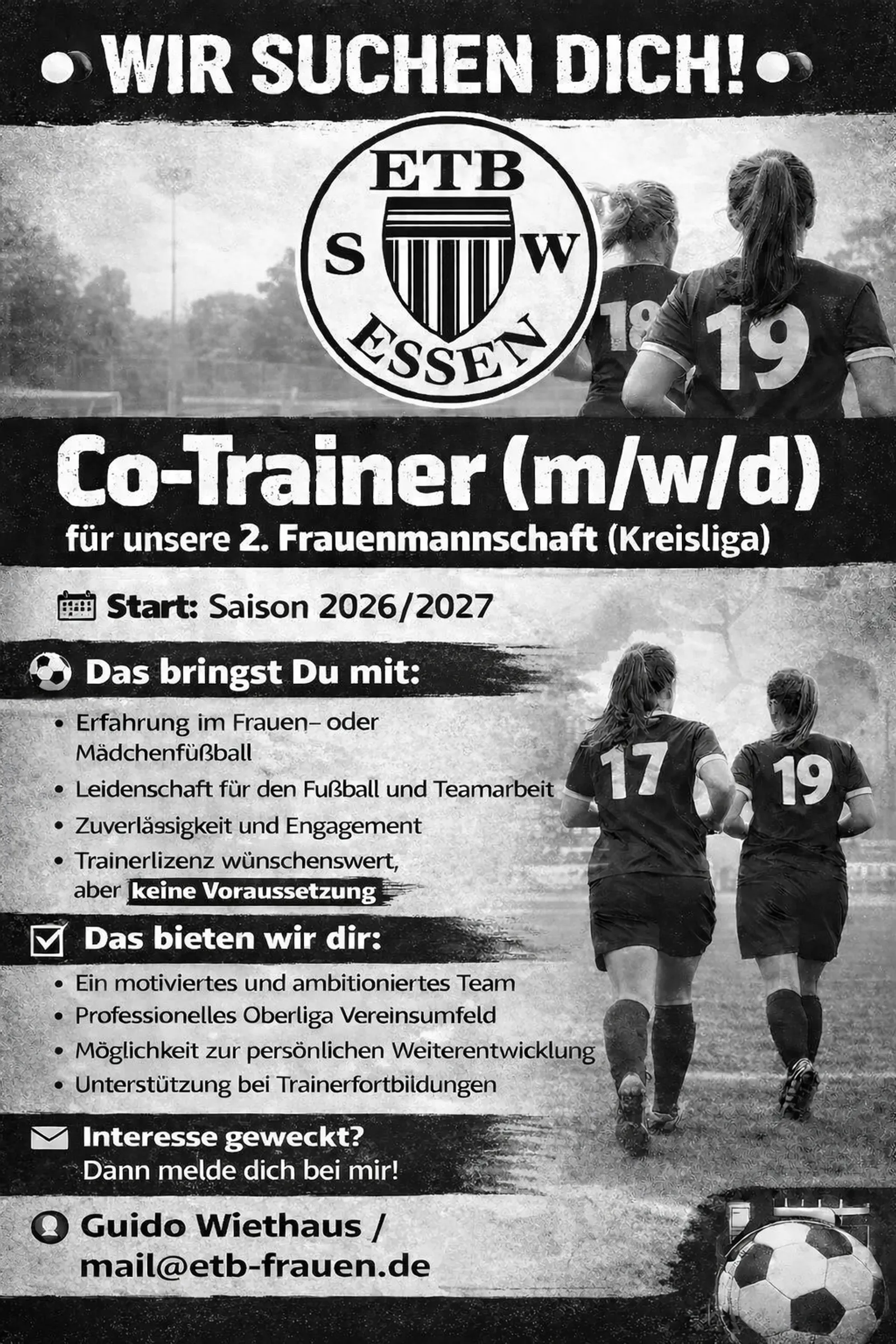 Wenn Du Erfahrungen im Frauen- und/oder Mädchenbereich mitbringst, zuverlässig, engagiert und ein Fussballfanatiker bist dann melde Dich bitte bei unserem sportlichen Leiter für den Frauenfußball Guido Wiethaus unter mail@etb-frauen.de.