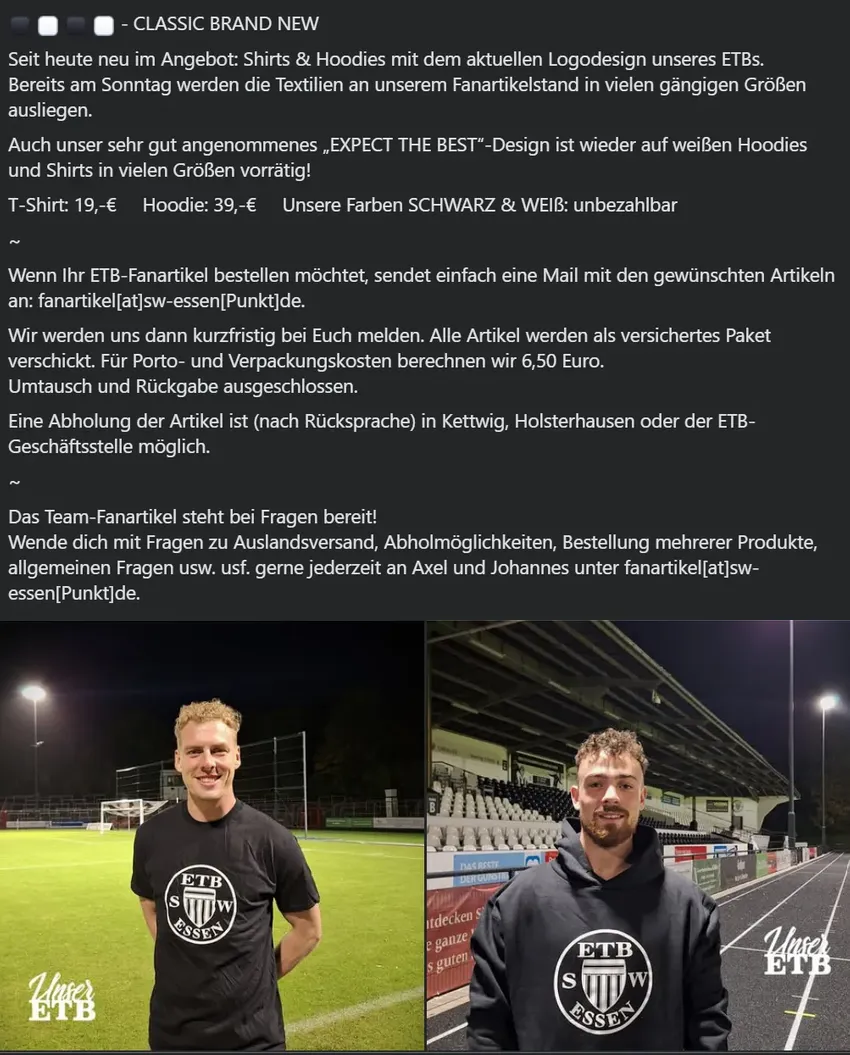 T-Shirt: 19,-€ Hoodie: 39,-€ Unsere Farben SCHWARZ & WEIß: unbezahlbar Wenn Ihr ETB-Fanartikel bestellen möchtet, sendet einfach eine Mail mit den gewünschten Artikeln an: fanartikel@sw-essen.de