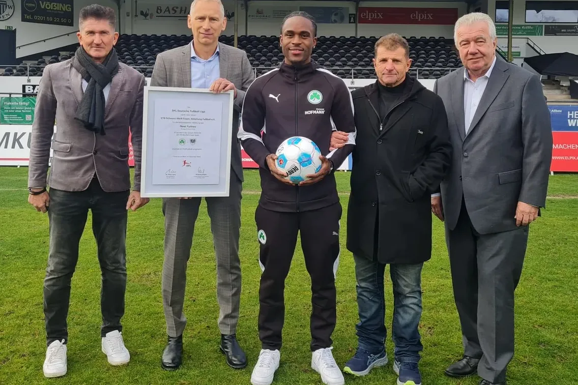 Bei der Auszeichnung war auch Noel Futkeu persönlich zugegen, den der ETB im Sommer 2022 vom 1. FC Köln zum Uhlenkrug zurückholen konnte. Der mittlerweile 22-Jährige erzielte in der Spielzeit 2022/23 für die Schwarz-Weißen 30 Tore in 32 Meisterschaftsspielen der Oberliga Niederrhein, ehe es ihn dann für ein Jahr zu Eintracht Frankfurt zog. Im Rahmen der Ausbildungshonorierung erhalten die Schwarz-Weißen rund 28.500 Euro von der Deutschen Fußball Liga, den sie für die Förderung der Jugend einsetzen werden.
