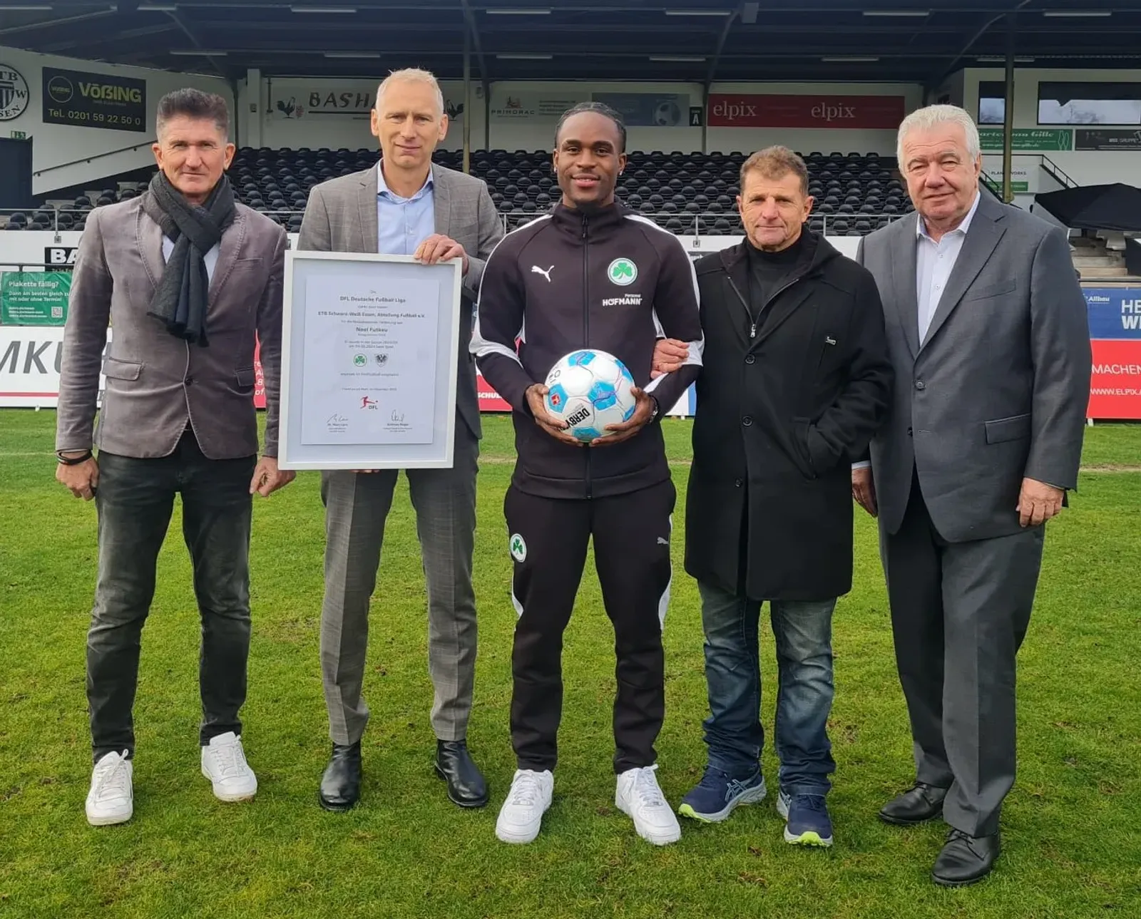 Bildunterschrift (von links): Günther Oberholz (ETB), Ansgar Schwenken (DFL-Direktor Spielbetrieb & Fans), Noel Futkeu, Karl Weiß (ETB), Peter Frymuth (FVN-Präsident und DFL-Vizepräsident).