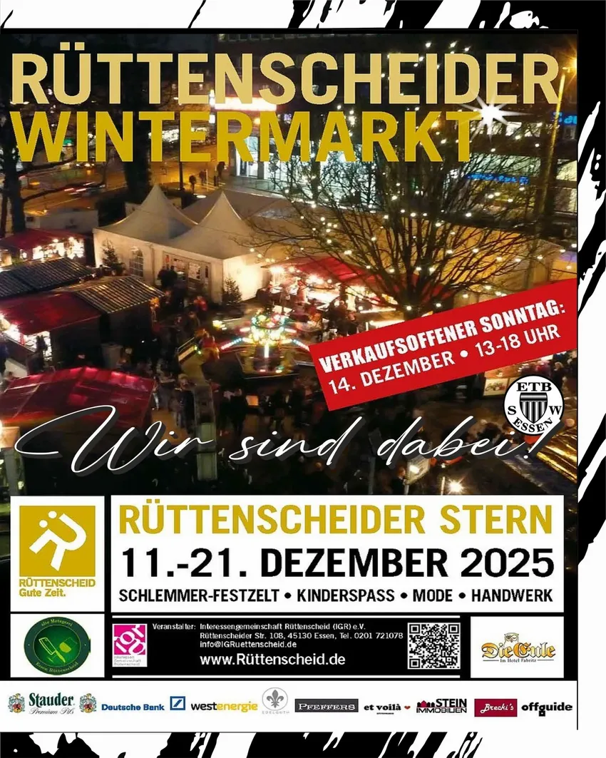 Alle sind herzlich willkommen. Lasst uns das Jubiläumsjahr gemeinsam schön ausklingen und dabei noch etwas Gutes tun. Termin: 18.-21. Dezember, jeweils von 13-21 Uhr auf dem 22. Rüttenscheider Wintermarkt (Rüttenscheider Str. / Klarastr.).