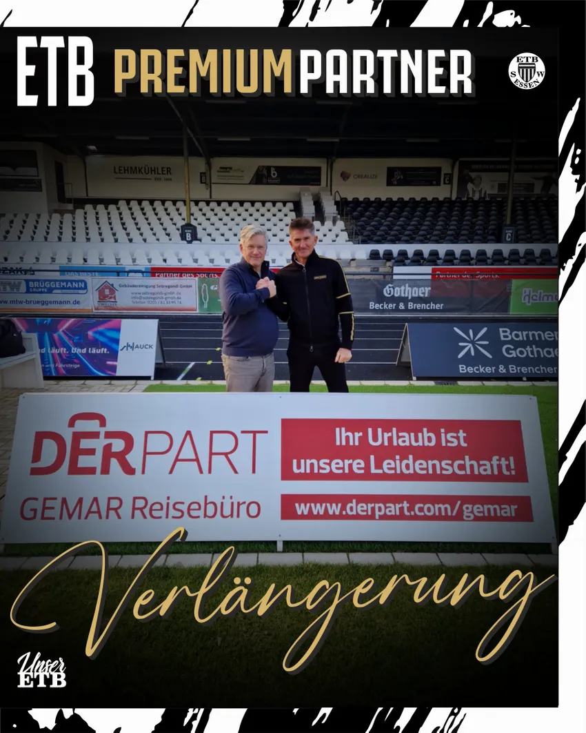 Seit drei Jahren besteht die Premium Partnerschaft zwischen dem ETB Schwarz-Weiß Essen, Abt. Fußball e.V. und dem DERPART Gemar-Reisebüro aus Essen-Holsterhausen. Die Vertragsverlängerung im Januar 2026 ist ein klares Bekenntnis für den gemeinsamen weiteren Weg.